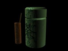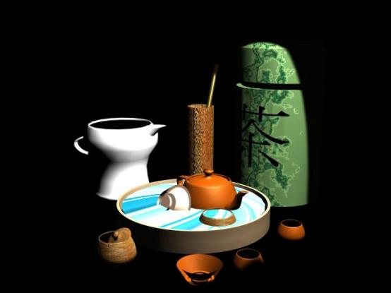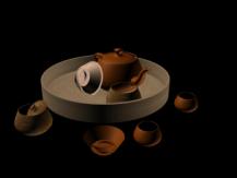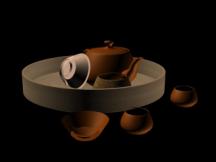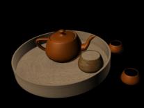(2) 再建立三個茶壺,只選擇Body(壺體),並把兩個(顏色選擇褐色)置於盤外、一個(選用材質Wood old)置於盤內,完成後如下圖。