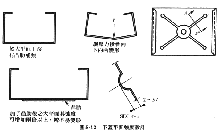 | 在一大平面上抽引凸肋,可增加平面強度,如圖5-12所示。 |