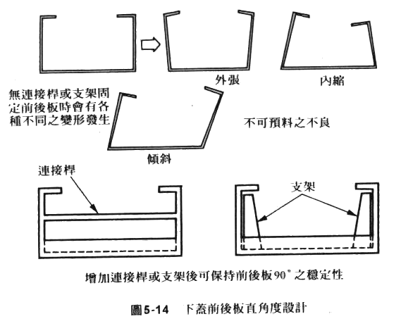 | 下蓋之前後板特別要求角度公差時,須加連接桿(Link bar)或支架(Bracket),以維持其直角度,如圖5-14所示。 |