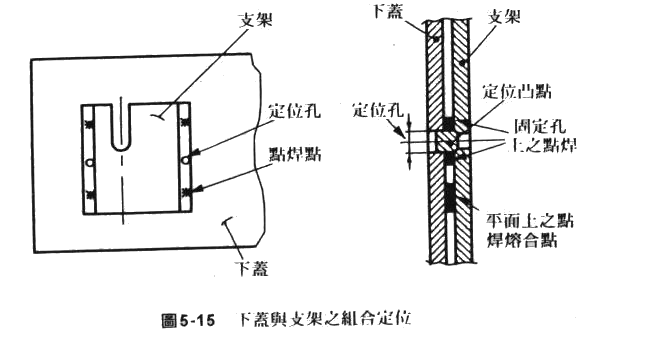 | 下蓋在點焊與支架(Bracket)組合時,可用治具或在組合件上做固定凸點及固定孔來定位。若以固定凸點及定位孔作業時,不可將點焊放在定位孔上,否則易脫落,如圖5-15所示。 |