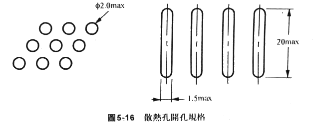 | PC在運作時,溫度會升高,為了使溫度不致太高,則需要適量的散熱孔使空氣對流,以降低溫度。但Safety要求其孔不能太大,造成不必要之危險。依UL、CSA要求圓孔內經不可大於φ2m/m,若為SLOT則寬不可大於l.5m/m,長不可大於2Om/m,如圖5-16所示。 |