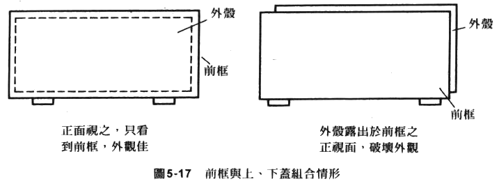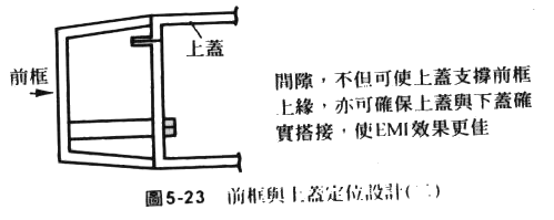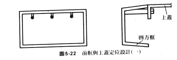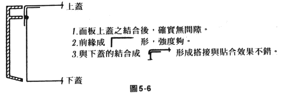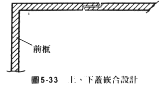 | 前框固定在下蓋時,在與下蓋組合後,其上緣之間隙不宜太大,以使上蓋插入後能支撐其上緣面,防止凹陷,如圖5-23所示。 | ||||