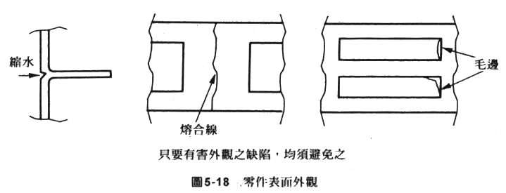 | 表面不得有縮水或明顯之熔合線或毛邊之現象,如圖5-18所示。 |