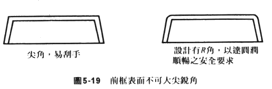 | 前框設計製造時,表面不可有尖銳角度之情形,以避免會刮傷操作者之情形,造或FCC缺點,如圖5-19所示。 |