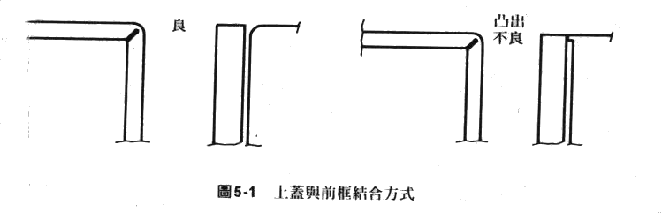 | 上蓋與前框結合時,折角處要平整,以免凸出造成前框有間隙,如圖5-1所示。 |