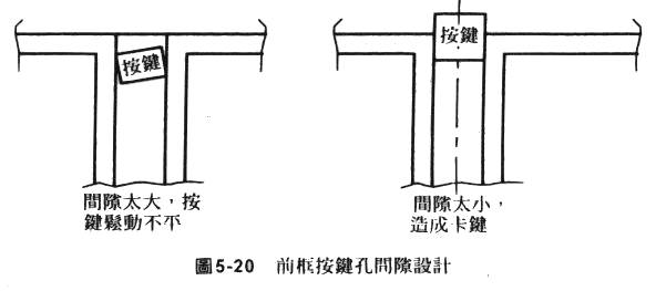 | 前框與電源開關按鍵之組合時,其間隙及操作性須詳加考慮,以防止因間隙太大造成鬆動或因間隙太小,造成卡鍵之現象,如圖5-20所示。 |