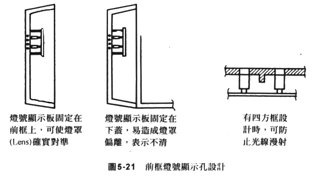 | 燈號顯示板(Led board)之裝配,儘可能以裝配在前面框(Bezel) 上,儘量避免在下蓋上,以防止LED無以對準燈罩(Lens) ,造成外觀上之缺陷,又LED與LED間,最好設計四方框(LIP)擋光,以避免光線漫射,造成外觀上之顯示不確實,如圖5-21所示。 |
