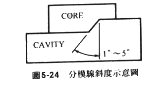 | 分模線最好保持同一平面,若實際需要,不能同一平面,則需注意保持一斜度,以利脫模,如圖5-24所示。 | |||