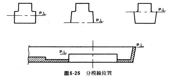 | 較特殊之形狀或複雜區域應考慮在外形上能允許有因鑲塊或滑塊而產生之接合線存在,如圖5-26所示。 | |||