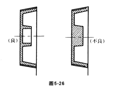 | 凸轂(B0SS):凸轂為穴之補強及組合時之嵌入或為支撐其他東西之 用。轂部的高度值限制於其直徑的兩倍以內,以求獲得結構強度。凸轂過高,由於空氣聚集,容易引起氣孔及充填不足,如必需有較高轂部則應於凸轂之側面設置增強肋,使材料流動容易。為避免凸轂根部外觀面有縮水,可於凸轂周圍偷料(削減肉厚),但不可切削太深,否則外觀面亦會有痕影產生,如圖5-30所示。 | ||||