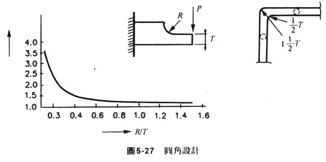 | 內圓角及外圓角(Radii and dillet)圓角作用為消除應力集中現象,製造出較大結構強度,並提供了流線形的流路,使其從模具頂出容易,節省模貝加工的優點。我們建議R最小為0.5mm,圓角R對於應力集中因素的影響,可看出最佳的圓角設計為R/T=0.6,超過這點之後,R即使再增加,也只能小部份減少應力集中現象,如圖5-27所示。 | ||||