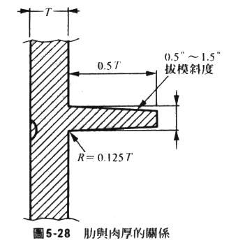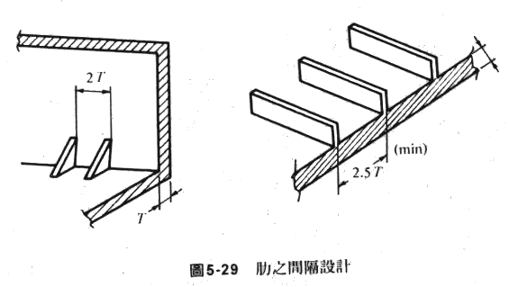 | 肋:凸緣或肋可用來增加成型品強度而不增加肉厚。這些設計不僅提供了強度,而且也在冷卻時避免了扭曲。一般說來,肋與肉厚之關係如圖5-28所示,如此凸出肋的後面才不致形成凹陷的外觀面。肋的方向最好與GATE同向。另外增強肋間之間隔儘可能在壁厚之2倍以上,如圖5-29所示。 | ||||