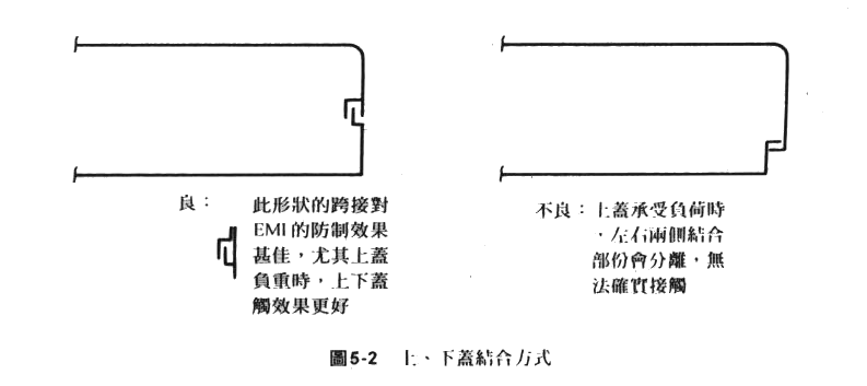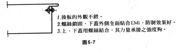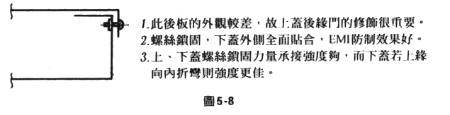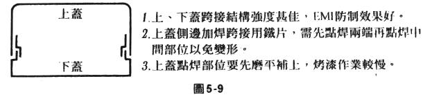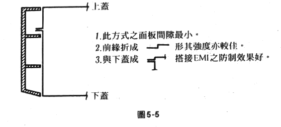 | 上蓋兩側,採用由上而下的跨接後搭接,結構強度及EMI防制效果佳。如圖5-9所示。 |