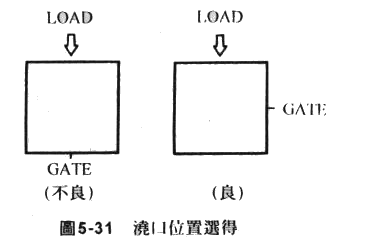 | 熔合線:熔合線位置儘量不要於外觀面出現,可利用澆口大小、形狀、數目或於澆口附近擋料,來決定熔合線位置為材料流動最後會合地方,故其結構強度較弱,應避開成品LOAD之處,如圖5-31所示 | ||||