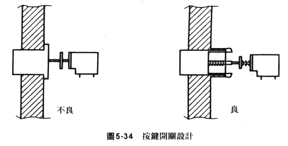 | 設計電源按鍵時(Power knob),避免直接套在電源開關(Powerswitch)之傳動桿(Lever)上,應採用間接傳動,如圖5-34所示。 |