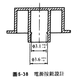 | 電源按鈕(Power knob)設計時,採浮動設計或間接傳動設計,以避免因尺寸誤差或電源開關傳動桿(Power switch lever)偏擺,所造成之卡鍵現象。浮動設計之電源開關按鈕(Power switchknob),如圖5-38所示。 |