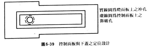 | 控制面板(Control panel)本身之設計應注意與下蓋之結合,必須有定位梢與定位孔之配合,以避免控制面板組合之歪斜,且與前面框(Bezel)之定位也需同時考慮,如圖5-39所示。 |