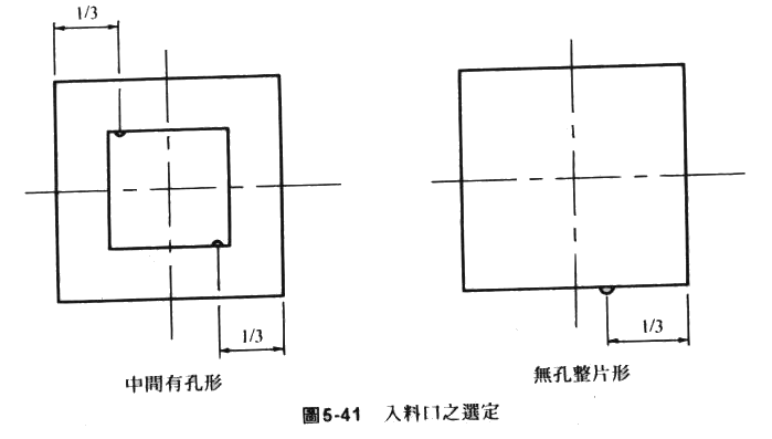 | 因門之面積均為中上,且有整齊線及外觀要求,對於流痕及變形都有影響入料處為成品之1/3處,如圖5-41所示。依經驗,請不要由中心及側面中心入料,其情形如圖5-42所示。 | ||