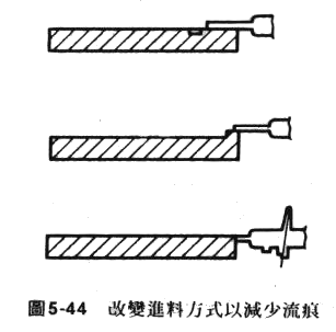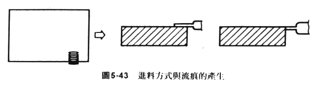 | 流痕為直接入料與頂珍入料最需擔心之事,因門面積不像前面板,且一定為平坦形,跑料迅速才產生的流痕,如圖5-43所示。 | ||