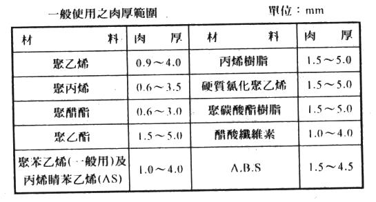 | 肉厚: 肉厚以各處均一為原則。並需考慮構造強度及能均勻分散衝擊作用力,儘量避免稜銳部薄內部之產生,以防充填不足。於實際產品設計上,常因結構及經濟原因,需作肉厚變化及形狀。階梯形厚度變化常易於外觀面形成變形現象,此點可由加R角或斜角改善之。應有不一致的內厚時,應如下表所示,逐步減低為佳。 | ||||
